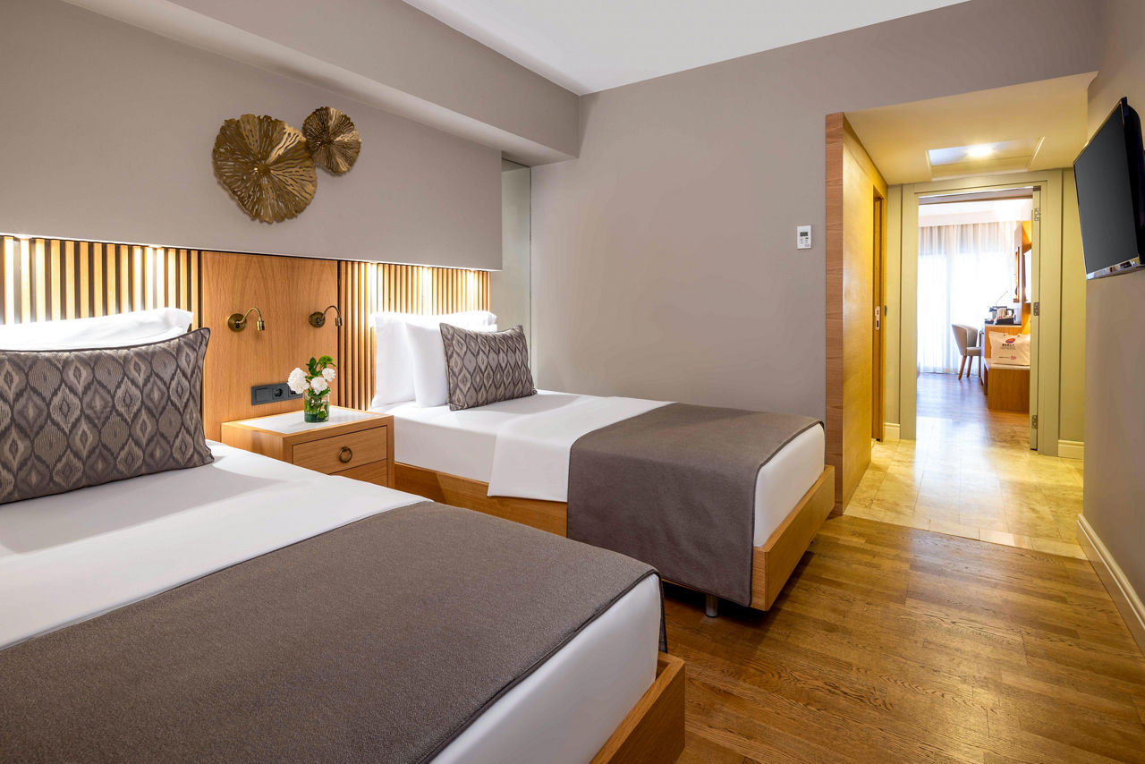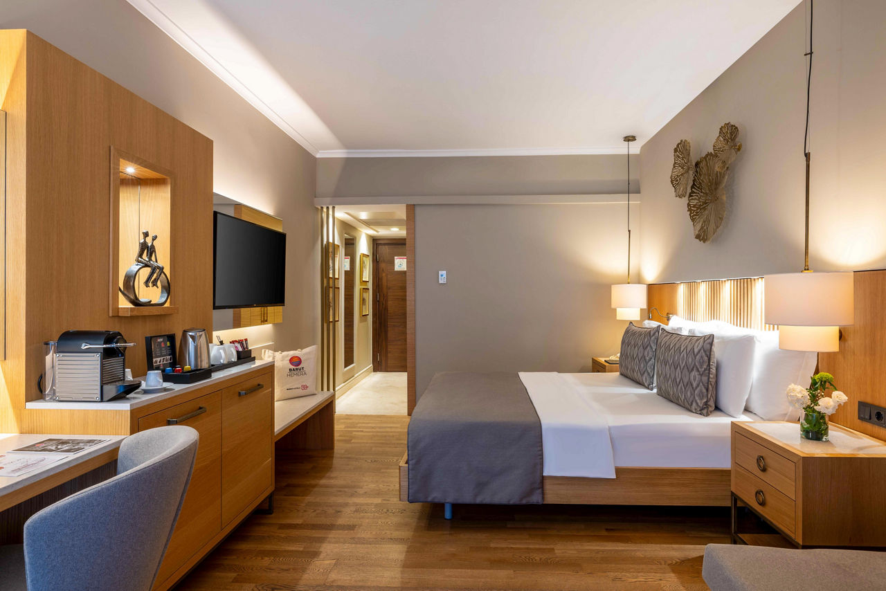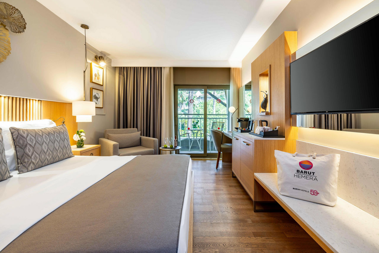 The Barut Hemera sits on a stunning private stretch of Side?s historic coastline, blending style, comfort, and attention to detail. Choose from elegant rooms, with options including swim-up access or terraces complete with private whirlpools for that extra-special stay. Savour flavours from a tempting choice of restaurants, or enjoy a full programme of activities and entertainment day and night. If relaxation calls, the serene spa is the perfect place to unwind and indulge. Families are well catered for too, with superb facilities for little ones, a fun-filled kids? club, and even a dedicated restaurant corner for younger guests. Promising luxury, fun, and relaxation in equal measure, Barut Hemera is an outstanding choice for both couples and families.Standard room with Land view sleep up to 3 adults and have a bathroom with shower only, hairdryer, TV, mini bar, Tea & coffee making facilities and air conditioning.