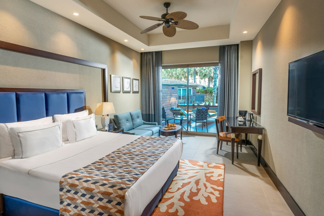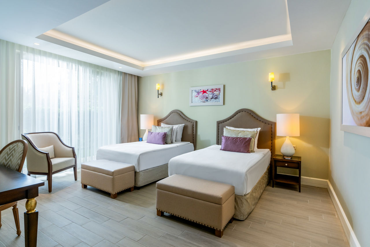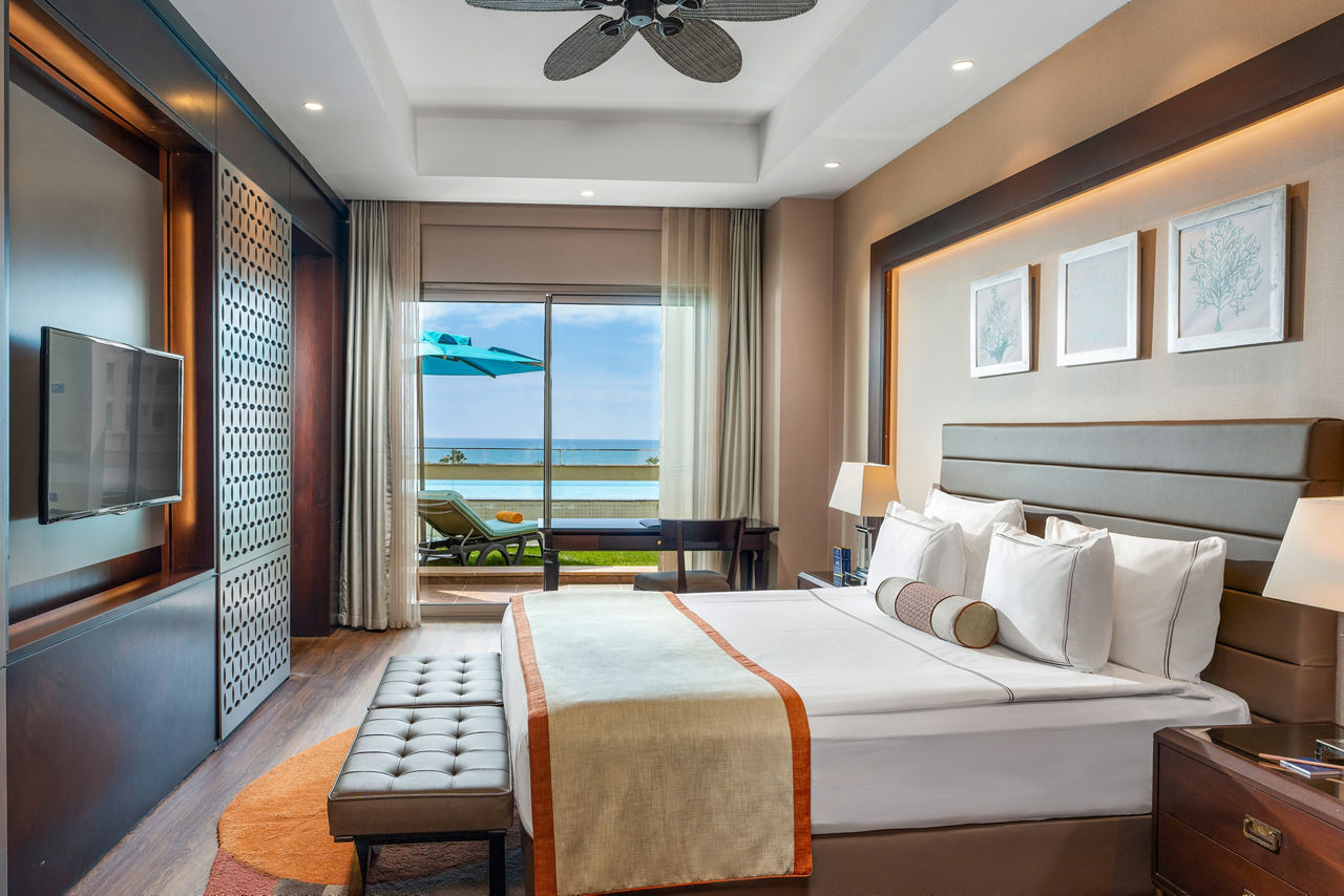 At Kaya Palazzo Golf Resort, you can do it all. Sit back and relax around the huge lagoon-style pool adorned with palm trees or step right onto the sandy beach and swim in the turquoise sea. There?s an aqua park to keep the kids grinning, plus ten international restaurants to tickle everyone?s taste buds. Feeling thirsty? Order your favourite drinks in one of the many bars and consider it quenched. To accommodate all the family, the suites have been designed with space in mind and you?ll be on All Inclusive Plus as standard for ease. A superb spa and fun-packed children?s club also await.Superior rooms with Sea View sleep up to 3 adults and have bathroom containing shower, hairdryer, flat screen television, fridge, tea & coffee making facilities and balcony. Room upgrade options and Sole Use rooms are also available.