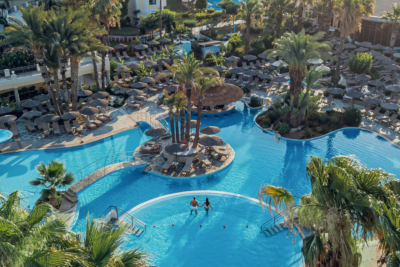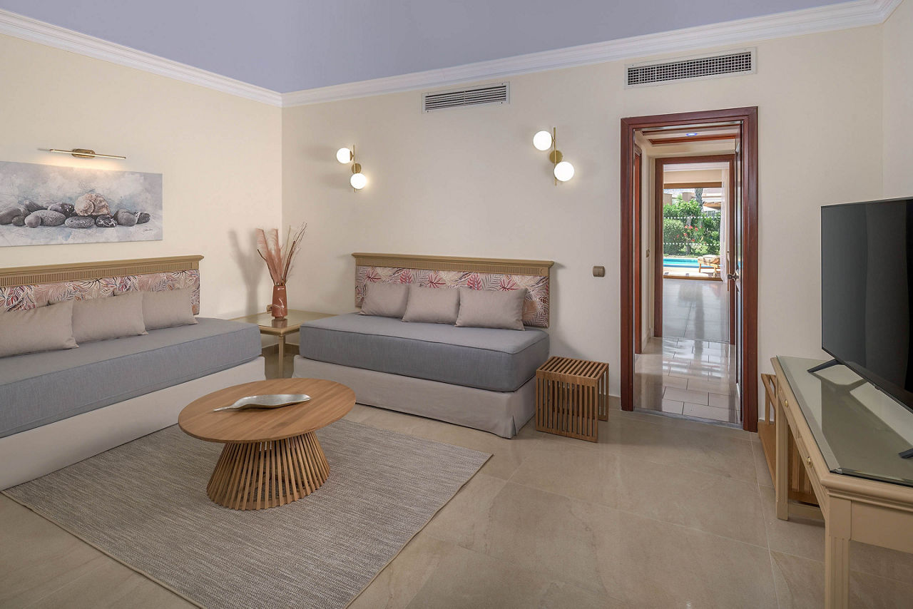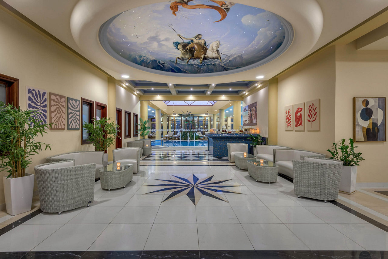 Where a combined ensemble of Greek and Italianate architecture meets the gentle ripples of three, palm-lined pools, a captivating complex waits to welcome you. As its name suggests, this palatial property provides villa accommodation, as well as gorgeous rooms and suites, all while the spa is its crowning standout. Prepare to be charmed by the Roman pillars, range of board bases and fabulous, family-friendly amenities too. Allow your toes to sink into the mix of sand and pebbles just a seafront stroll away. Then, delight your senses upon return with the smorgasbord of tempting buffet and ? la carte dishes, why not opt for All Inclusive Plus where dining is a delight across the quintet of restaurants?Double rooms sleep up to 3 adults or 2 adults and 1 child and have air-conditioning, hairdryer, satellite TV, mini-bar*, tea and coffee making facilities, full bathroom, bathrobes and slippers and balcony or terrace. Disabled rooms are available on request. Side sea view and Sea view rooms, Junior suites with whirlpool bath and Family suites with whirlpool bath and separate lounge are also available. Deluxe villas with pool sleeping up to 3 adults, Executive villas sleeping up to 4 adults and Presidential villas sleeping up to 5 adults with two bedrooms and two bathrooms are also available. All villas have private heated pools and a terrace, and include free access to the Thalasso Spa Centre and a separate breakfast area with à la carte specialities