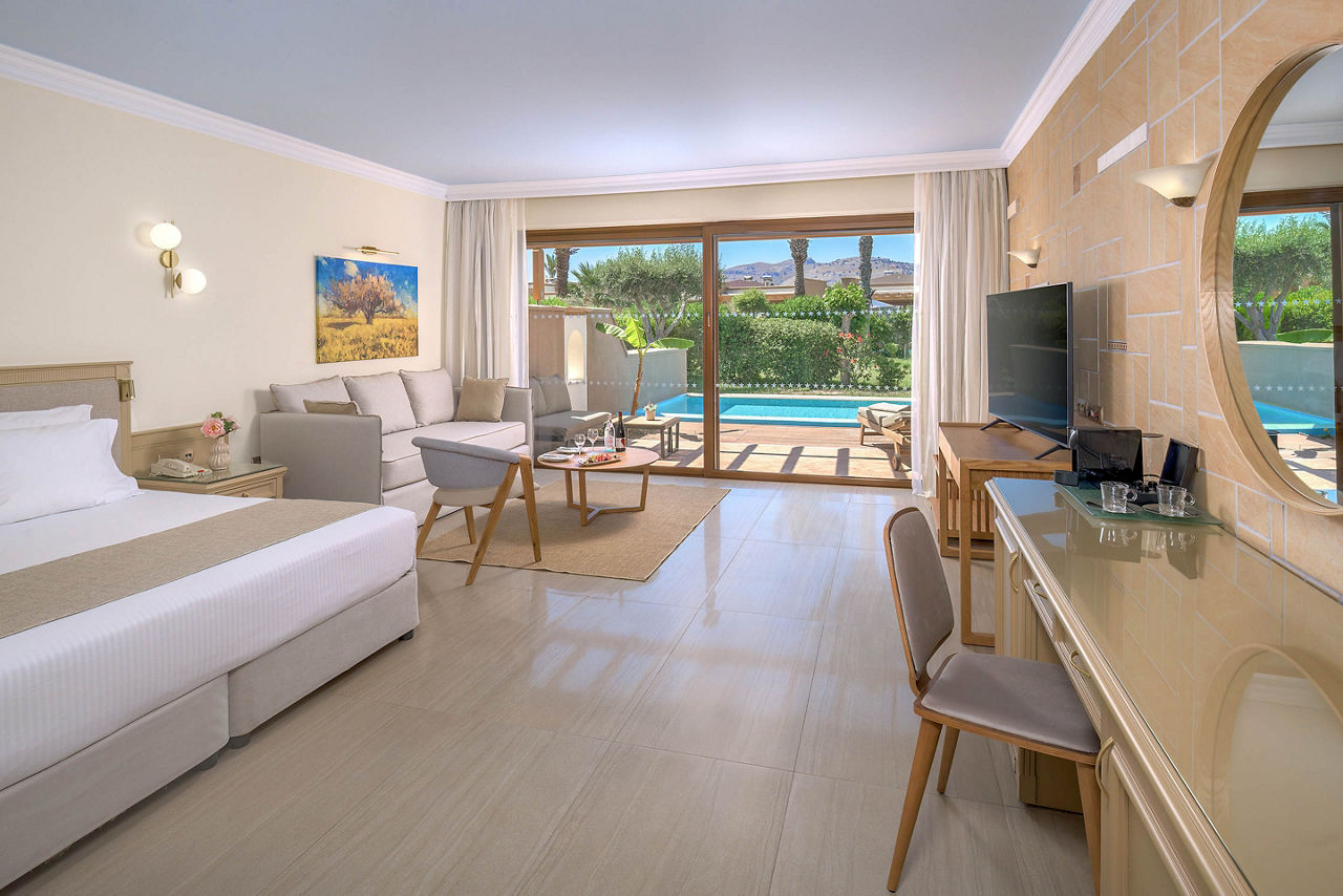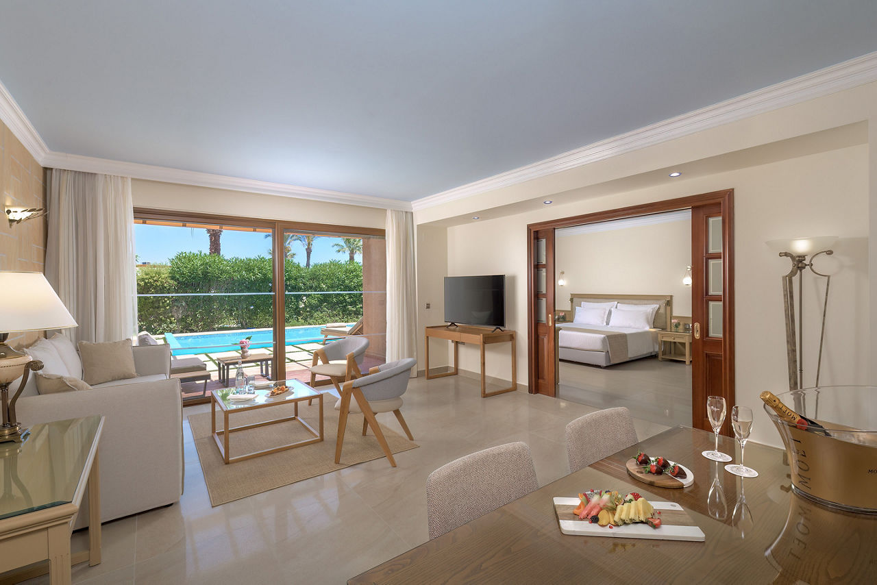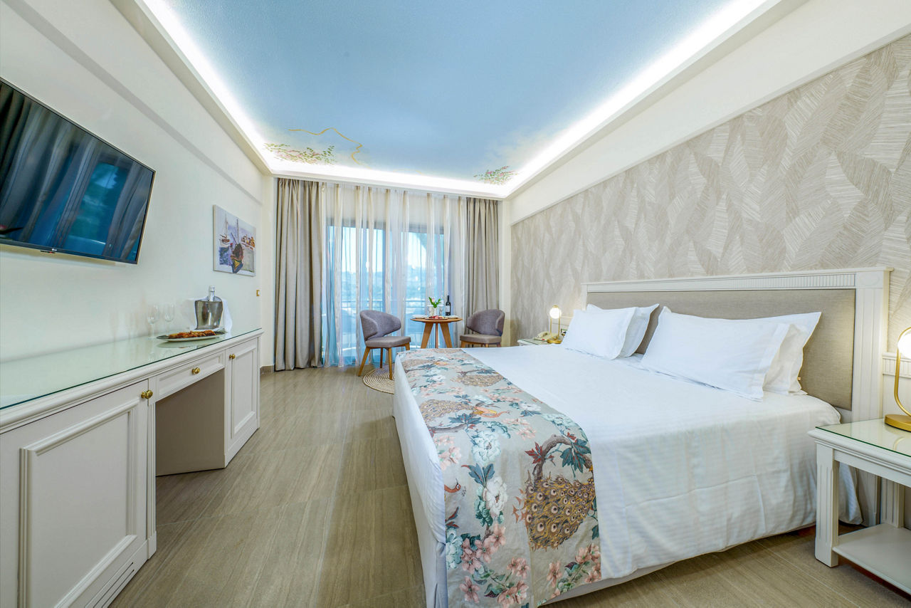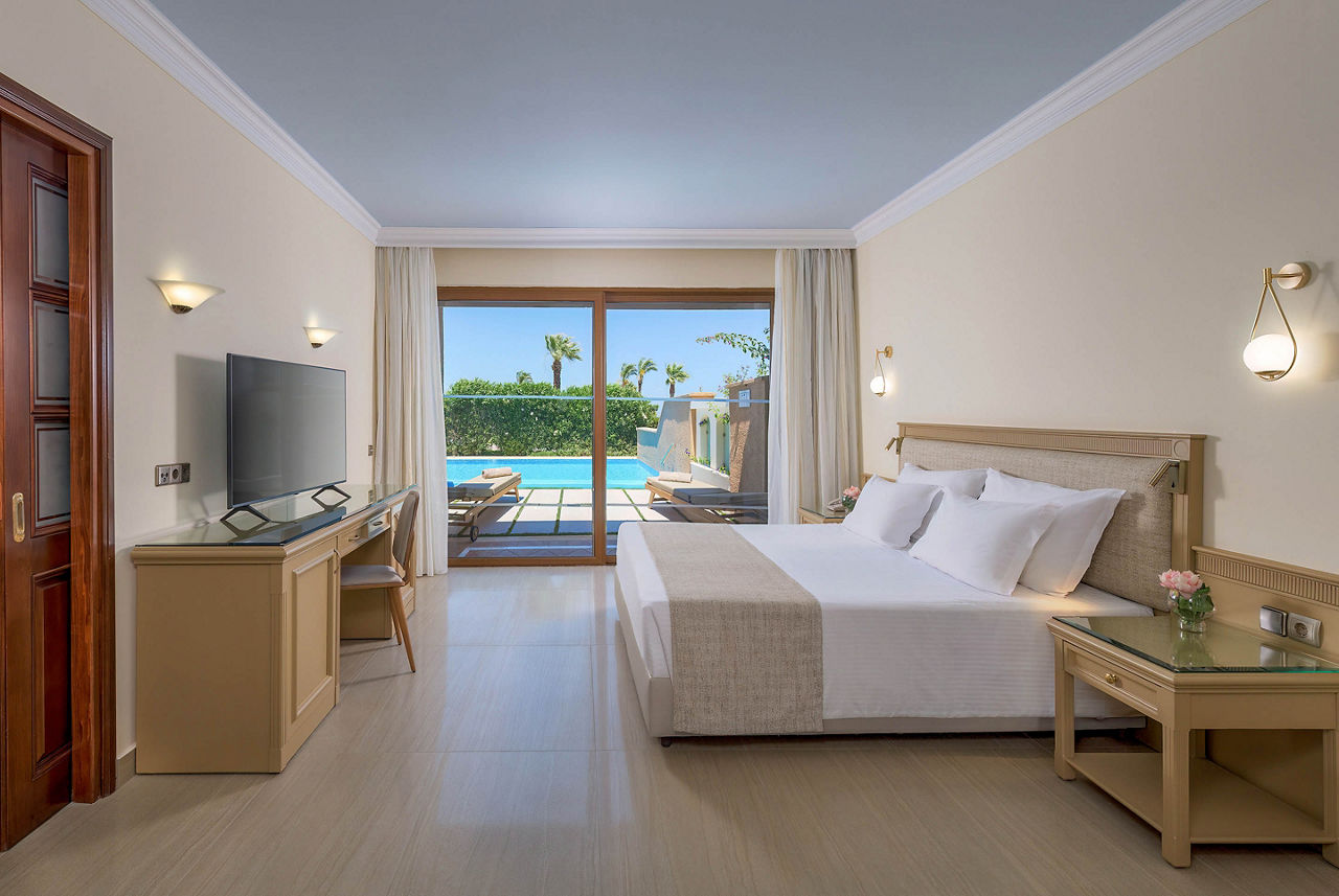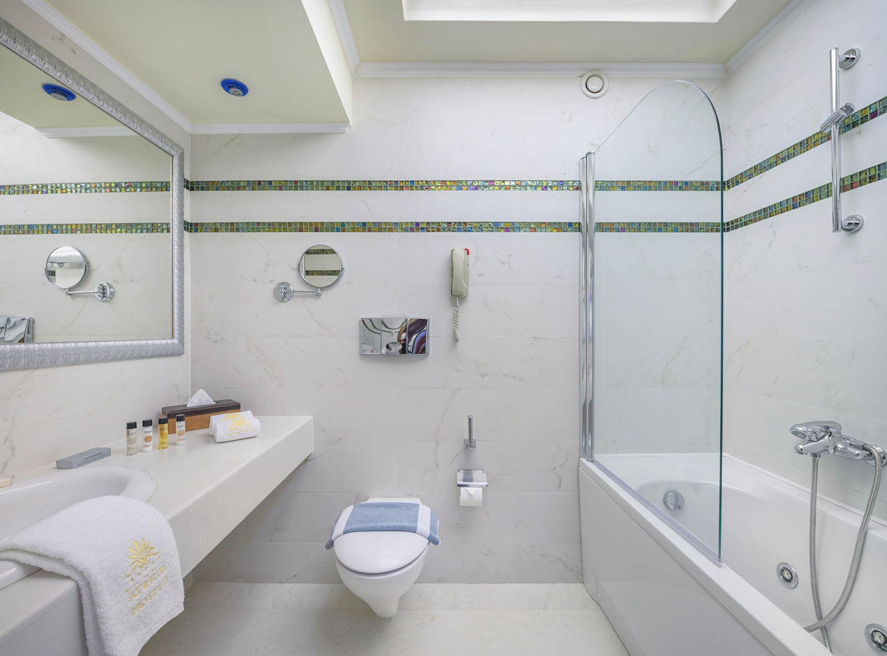 Double rooms sleep up to 3 adults or 2 adults and 1 child and have air-conditioning, hairdryer, satellite TV, mini-bar*, tea and coffee making facilities, full bathroom, bathrobes and slippers and balcony or terrace. Disabled rooms are available on request. Side sea view and Sea view rooms, Junior suites with whirlpool bath and Family suites with whirlpool bath and separate lounge are also available. Deluxe villas with pool sleeping up to 3 adults, Executive villas sleeping up to 4 adults and Presidential villas sleeping up to 5 adults with two bedrooms and two bathrooms are also available. All villas have private heated pools and a terrace, and include free access to the Thalasso Spa Centre and a separate breakfast area with à la carte specialities