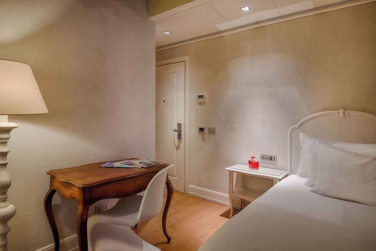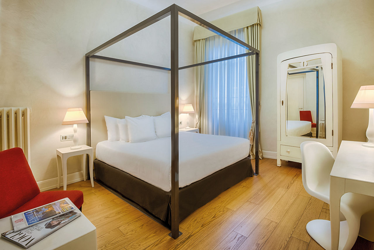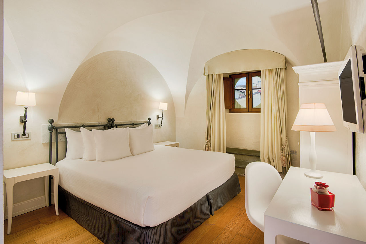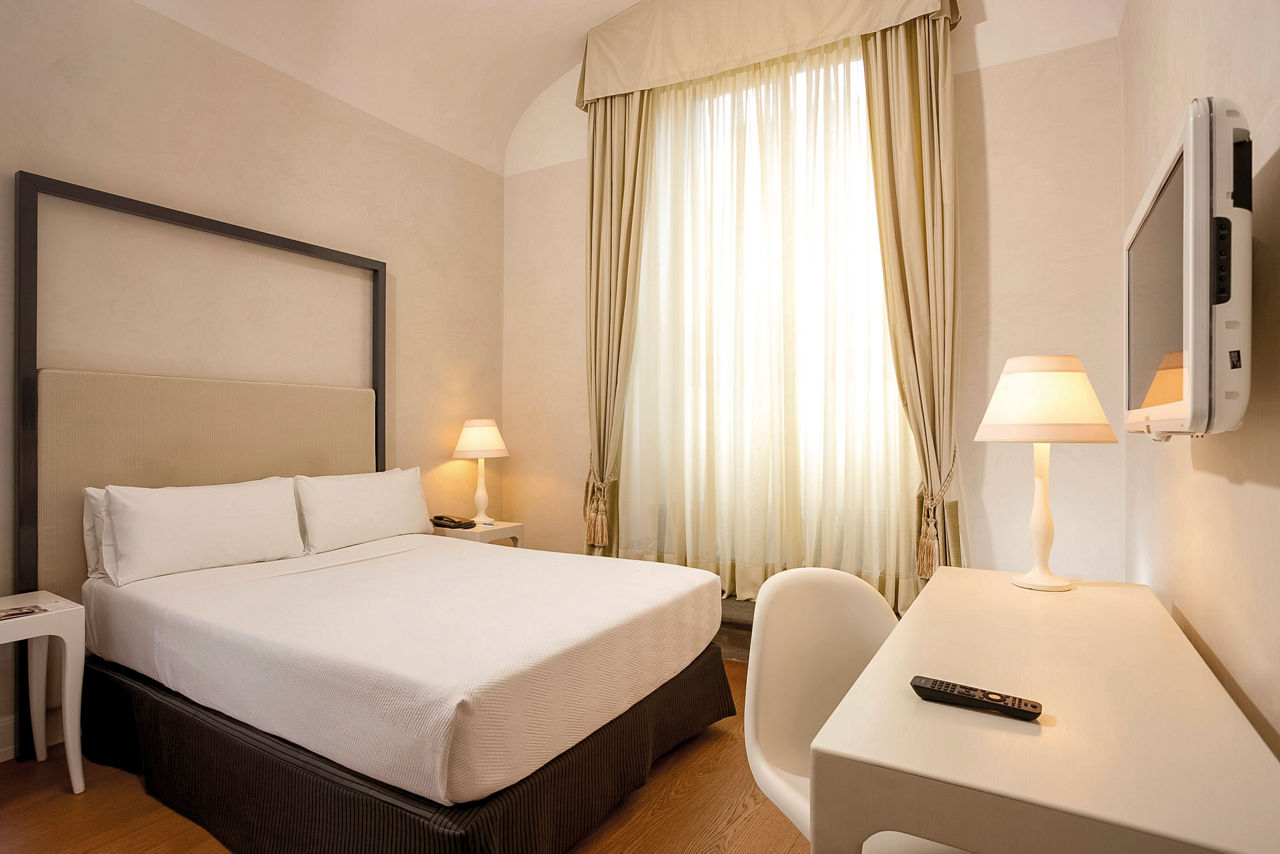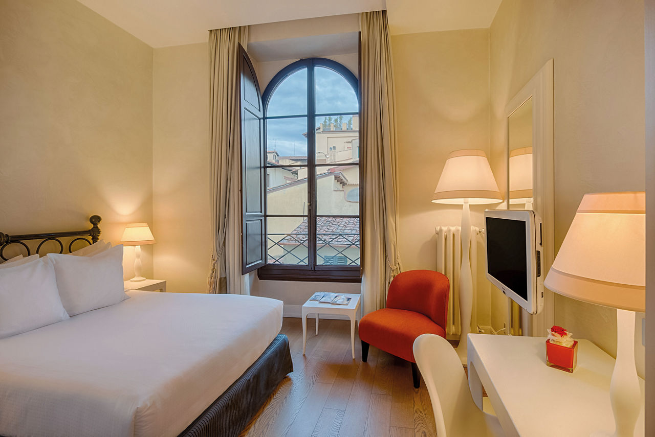 Built in the 12th century, this hotel is a historical landmark and thought to be one of the oldest hotels in Italy. With modern adaptations of classical beauty, the hotel perfectly fuses old-world charm with sophisticated, modern furnishings. The ornate stained glass ceiling in the lobby and the beautiful antique furniture throughout, allows you to experience traditional Florentine luxury while embracing modern comforts for a relaxing stay. With the hotel just a few minutes walk away from some of the main attractions and local transport links, the NH Collection Firenze Porta Rossa is an enviable hotel for your latest city break!Double and twin rooms sleep 2 adults and have bathroom containing a bath or shower, air conditioning, hairdryer, slippers, television, mini-bar and safety deposit box. Room upgrade options and Sole Use rooms are also available.