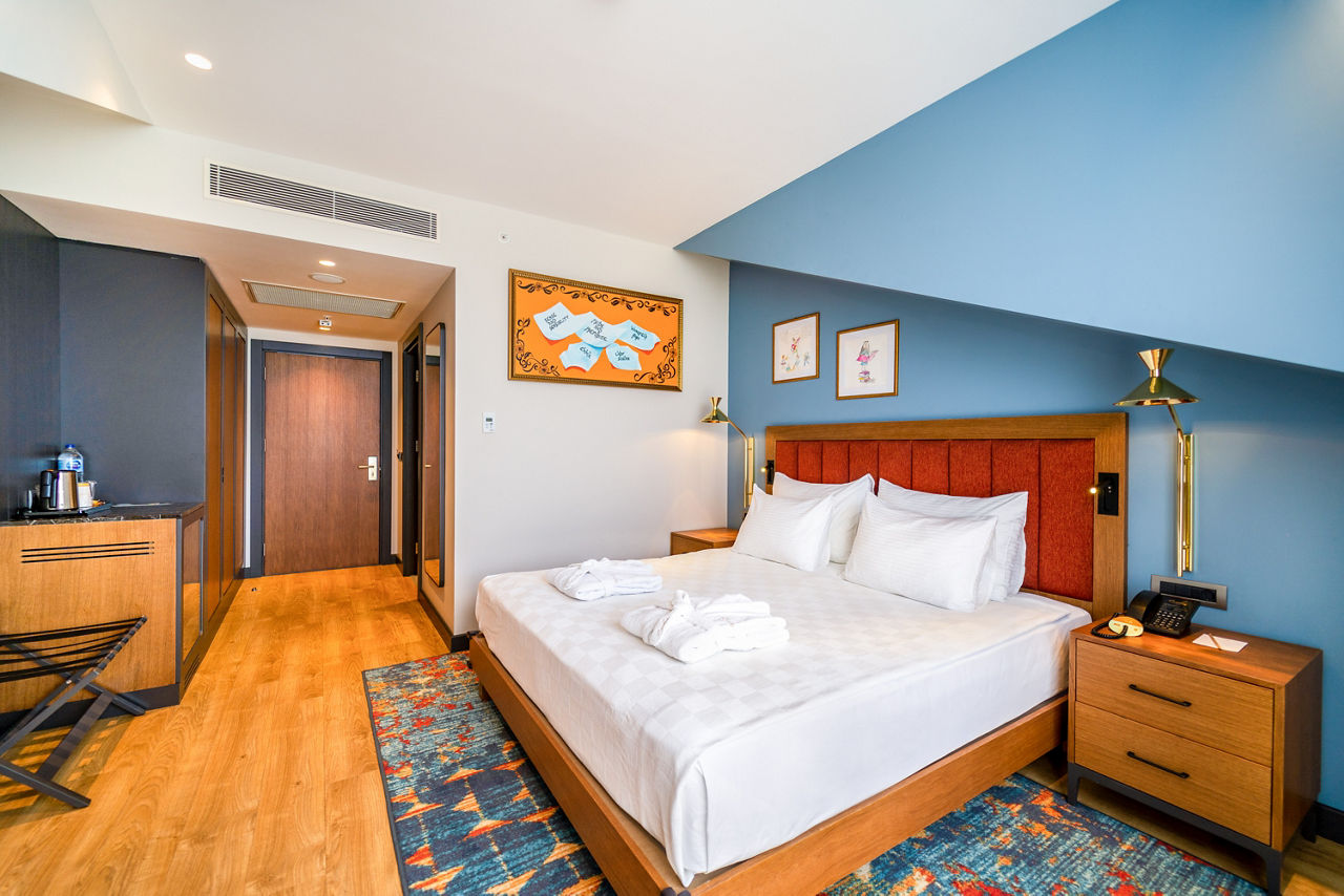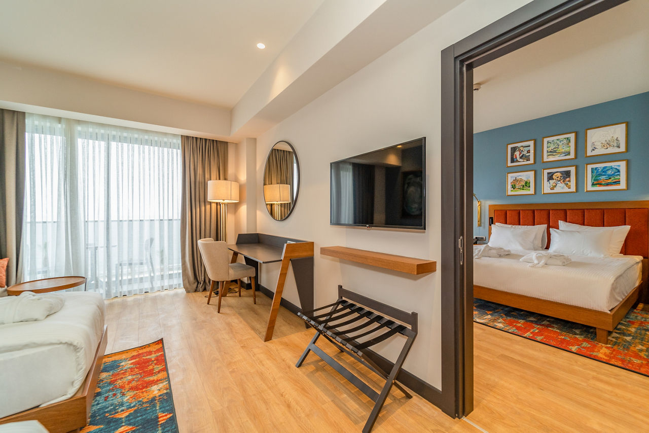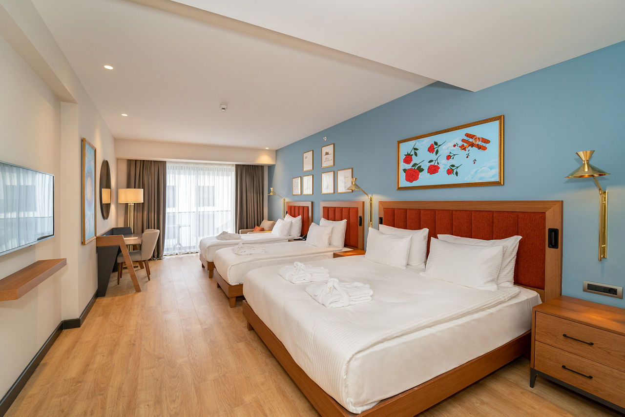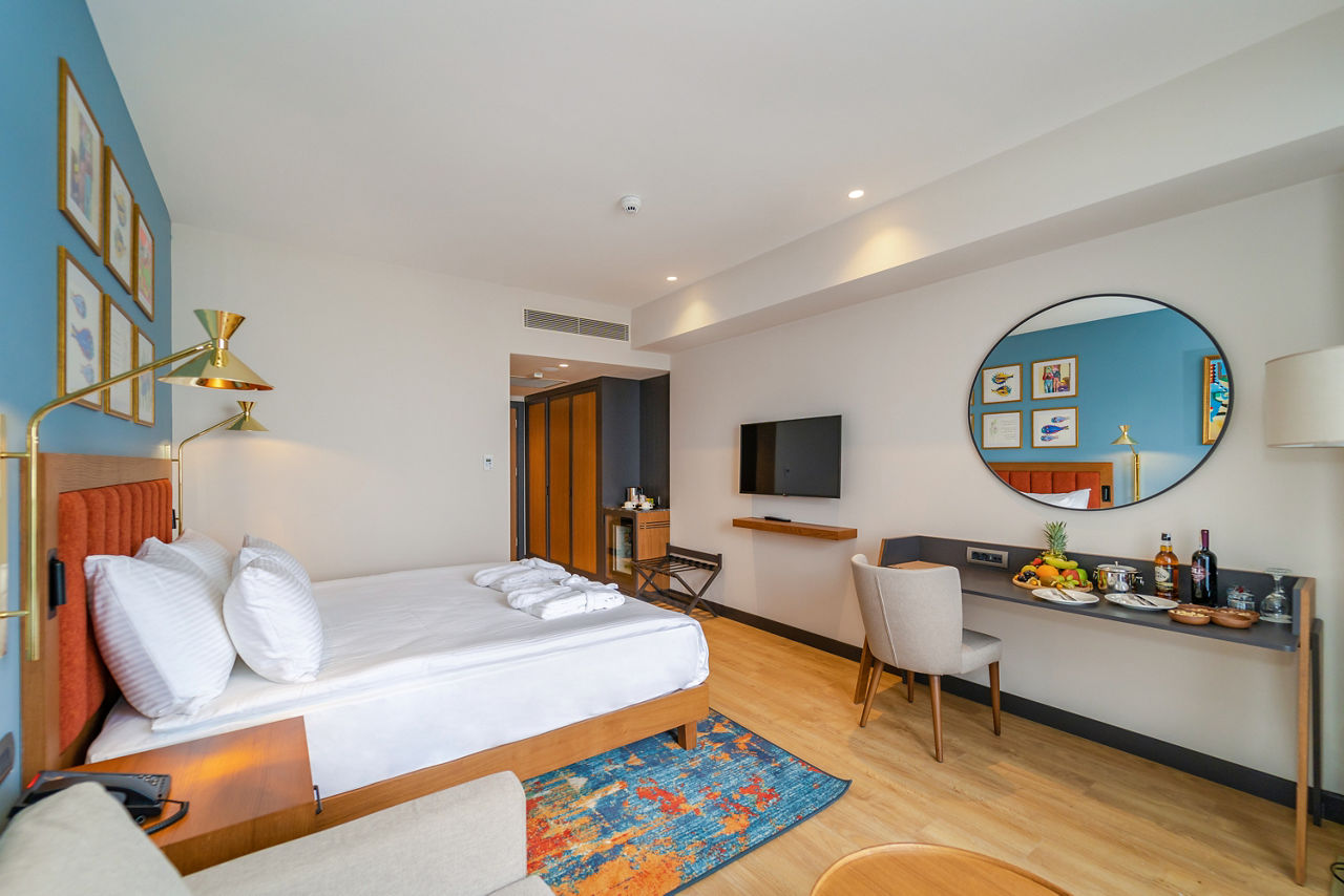 With modern décor and luxurious facilities, the Sundia Exclusive by Liberty Fethiye is a real treat for guests of all ages. Stunning scenes await in every corner here, sip on a cocktail whilst taking in the panoramic views of Fethiye bay from the rooftop bar. You can spend days soaking up the sun at the dazzling pool area, or take advantage of the perfect beachfront location with a trip to gorgeous Calis beach. The rooms are beautifully furnished and spacious with upgrades available including rooftop sea view rooms. Great for both couples and families looking for a relaxing Turkish getaway ? Sundia Exclusive by Liberty Fethiye ticks all the boxes.Standard Double or Twin rooms sleep up to 3 adults and have bathroom containing a shower, air conditioning, hairdryer, flat screen television, tea & coffee facilities and balcony.