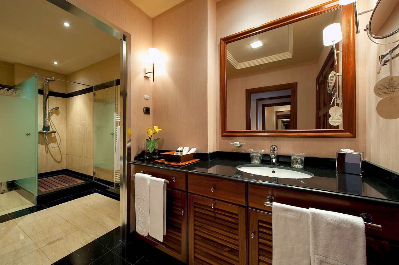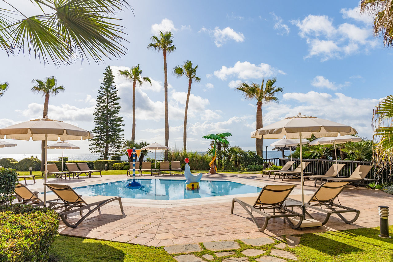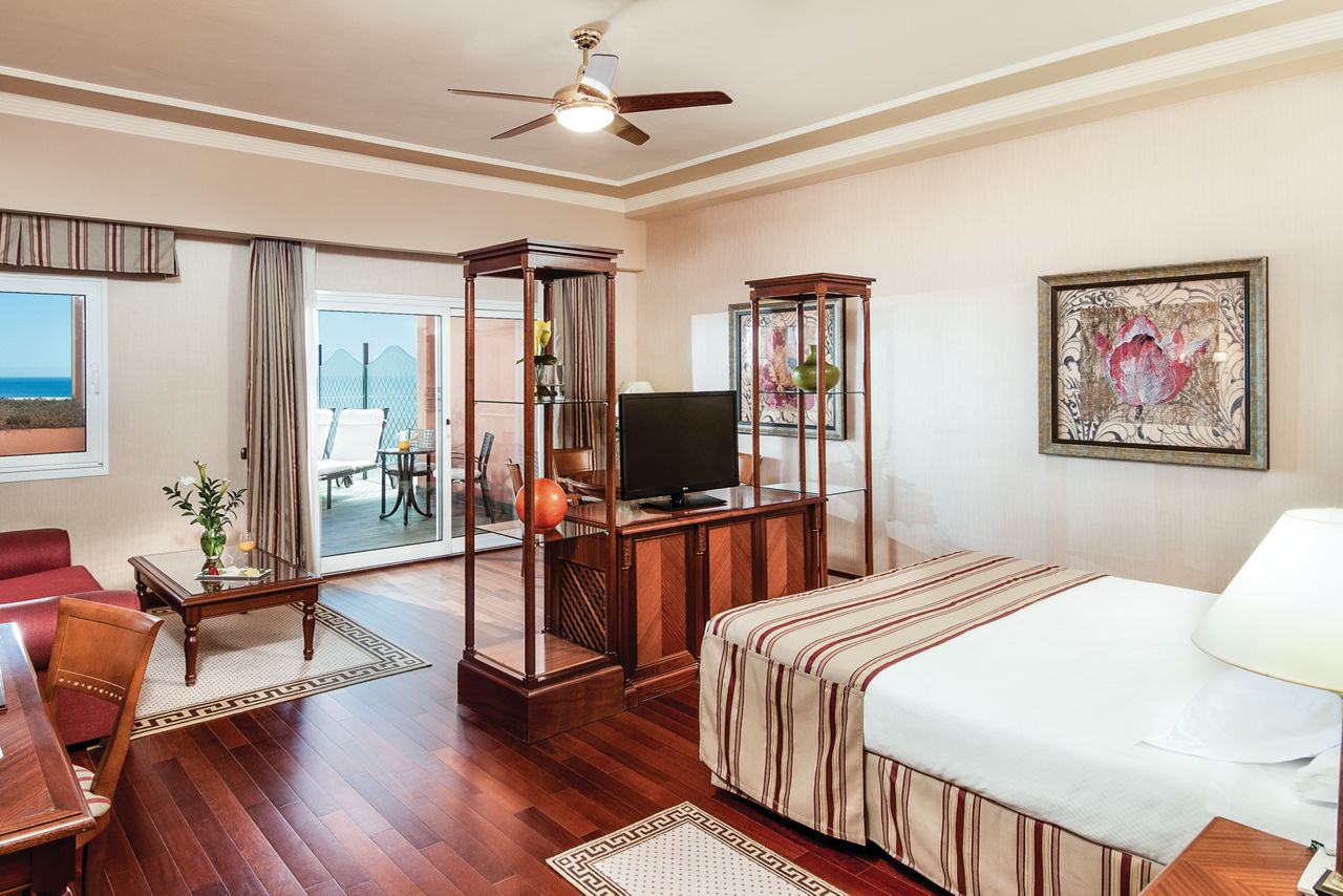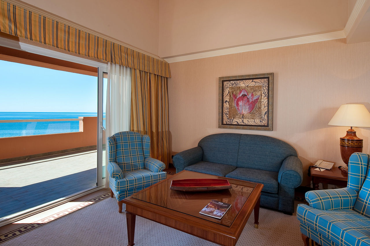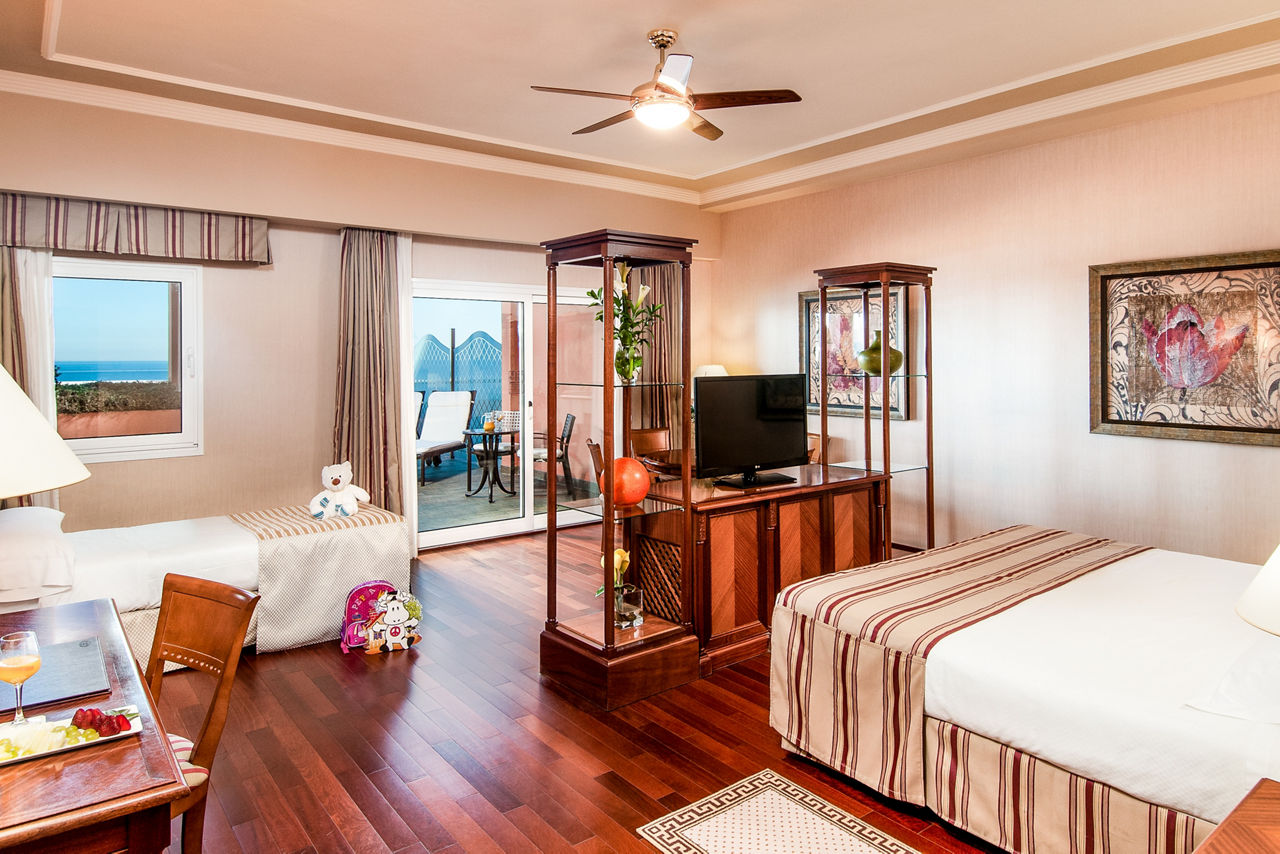 Double rooms with Sea View sleep up to 2 adults and 1 child and have a full bathroom, hairdryer Bathrobes & slippers, air conditioning, satellite TV and terrace with balcony. Junior Suites with Sea View sleeping up to 2 adults and 1 child are also available at a supplement; they are larger and have larger balconies up to 19.7m2. Suites with Sea View are also available at a supplement; they are even larger and have a separate living room and 16m2 terraces. Deluxe Family rooms are also available.