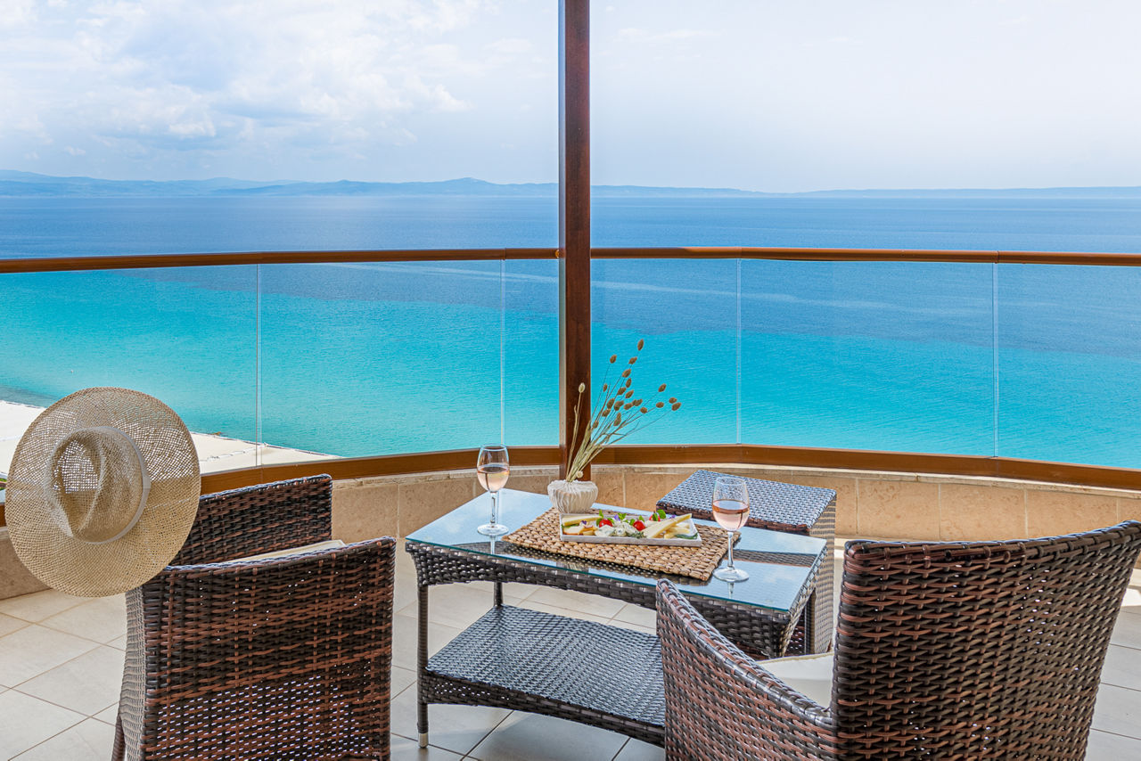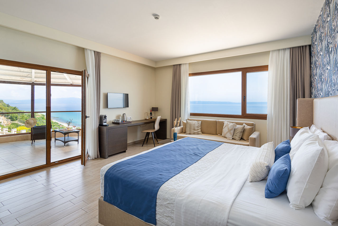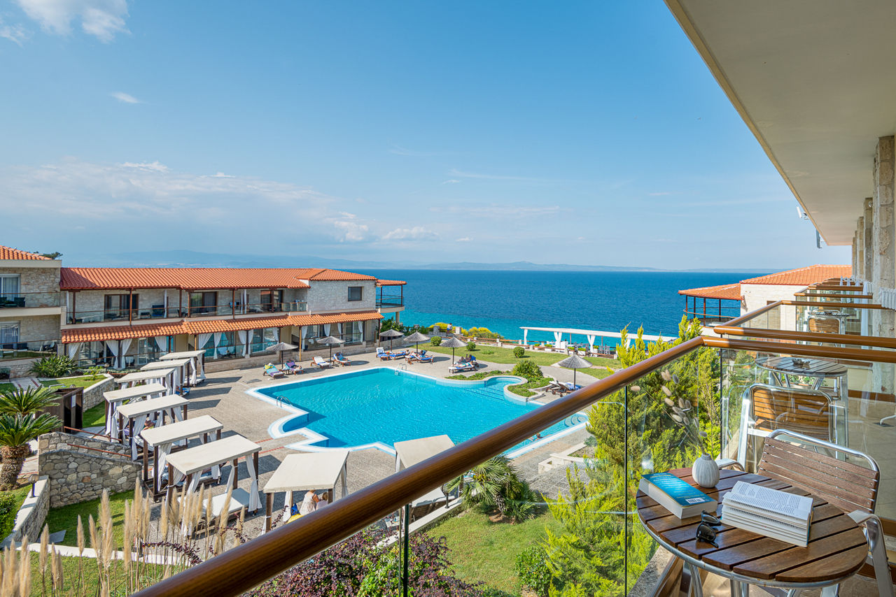This delightful adults-only coastal retreat, Blue Bay Hotel Halkidiki, is located close to the traditional village of Afitos. Boasting spectacular views of the Toroneos Gulf, you can spend your days unwinding around the pool area, strolling to the nearby beach, or savouring the charm of local taverns and bars. The hotel offers a choice of restaurants and, for those seeking something truly romantic, a private candlelit dining experience. It's the perfect destination for couples looking for a relaxing escape.Double rooms with Side Sea View sleep up to 3 adults and have bathroom containing a bath or shower, air conditioning, hairdryer, television, fridge and balcony or terrace. Room upgrade options are also available.