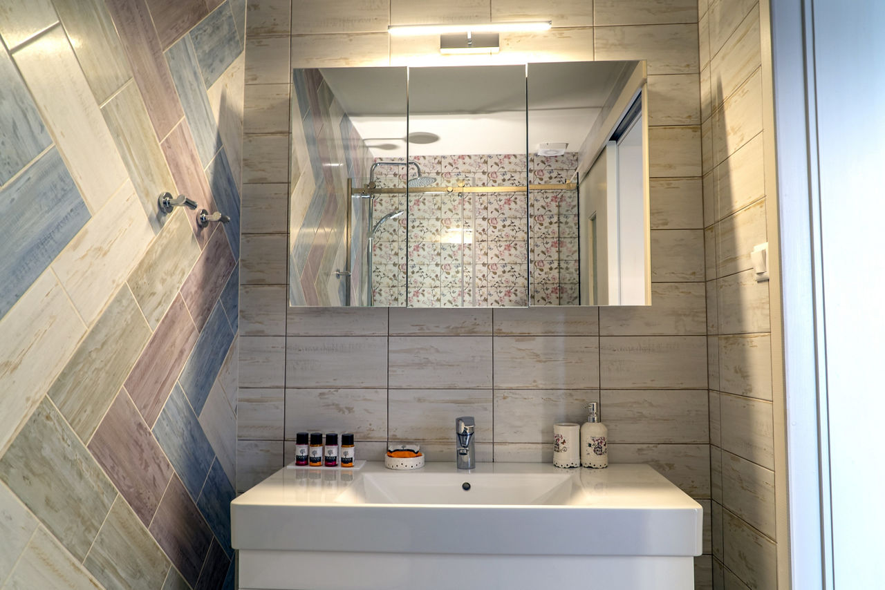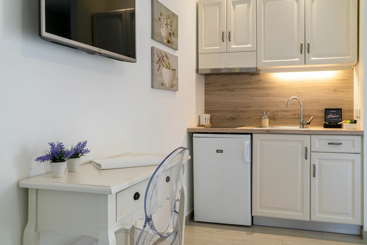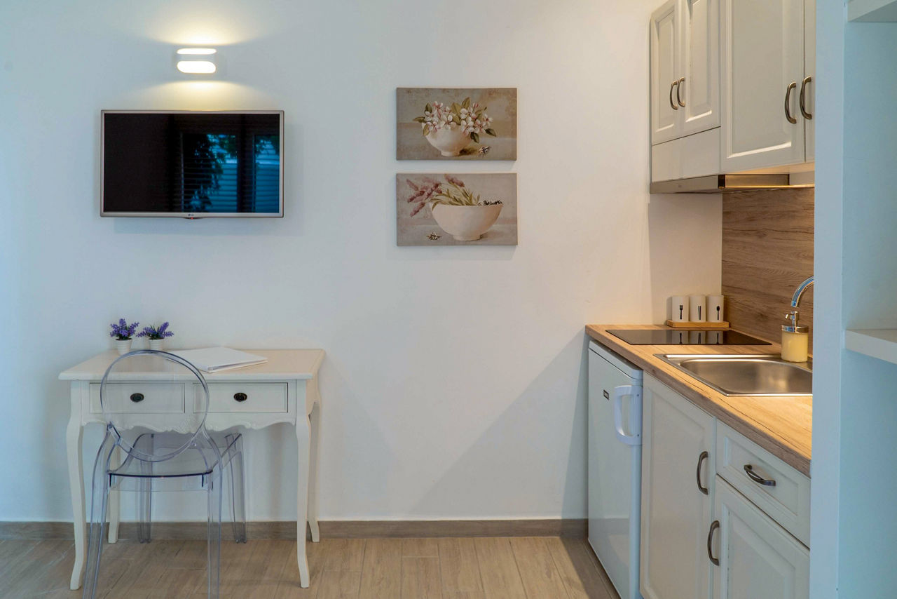 Studios sleep up to 2 adults and have bathroom containing a shower, air conditioning, hairdryer, bathrobe and slippers, television, kitchenette and balcony.