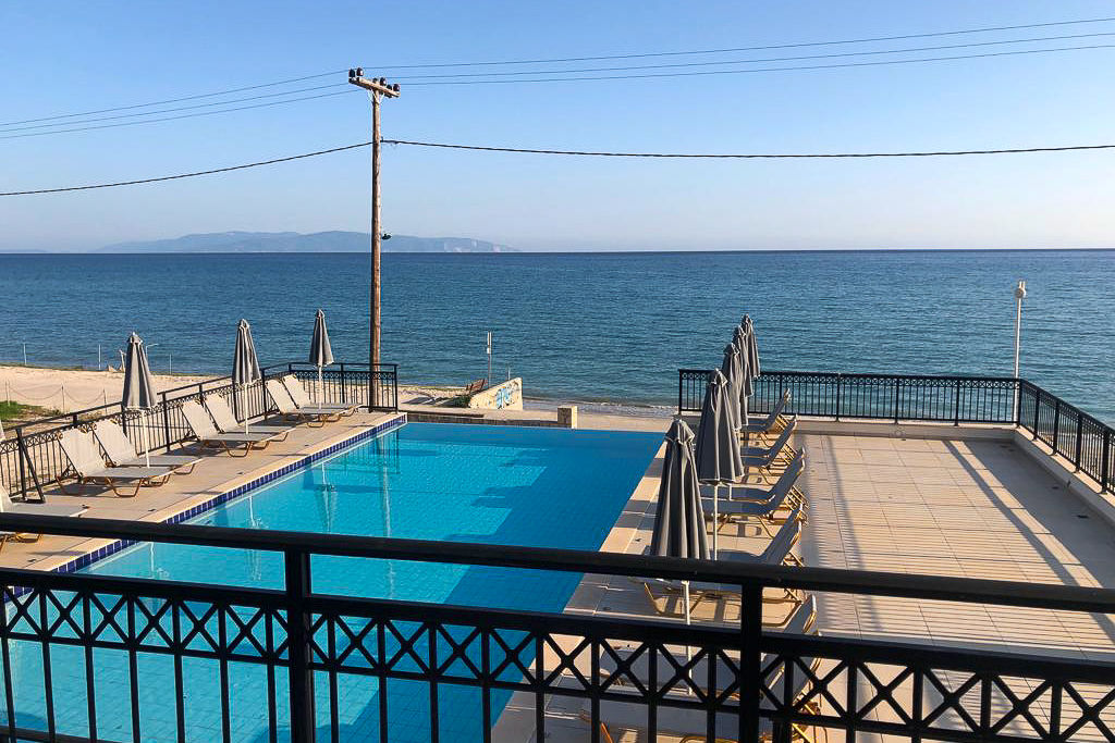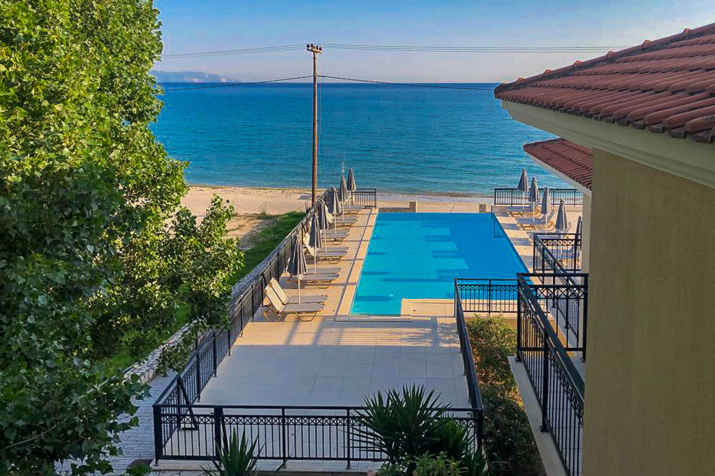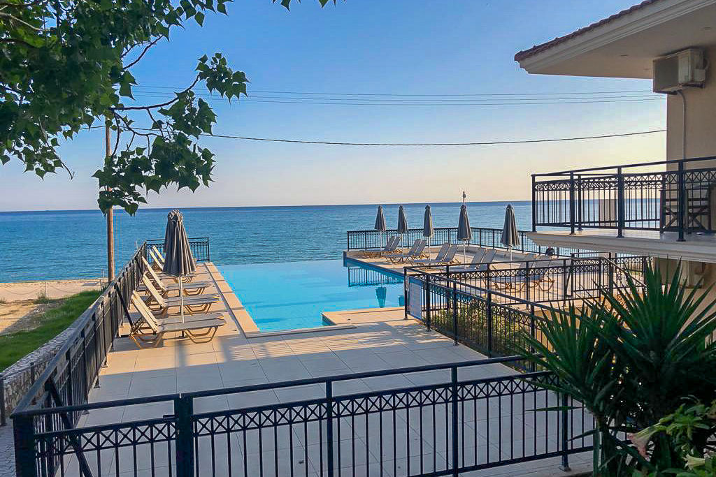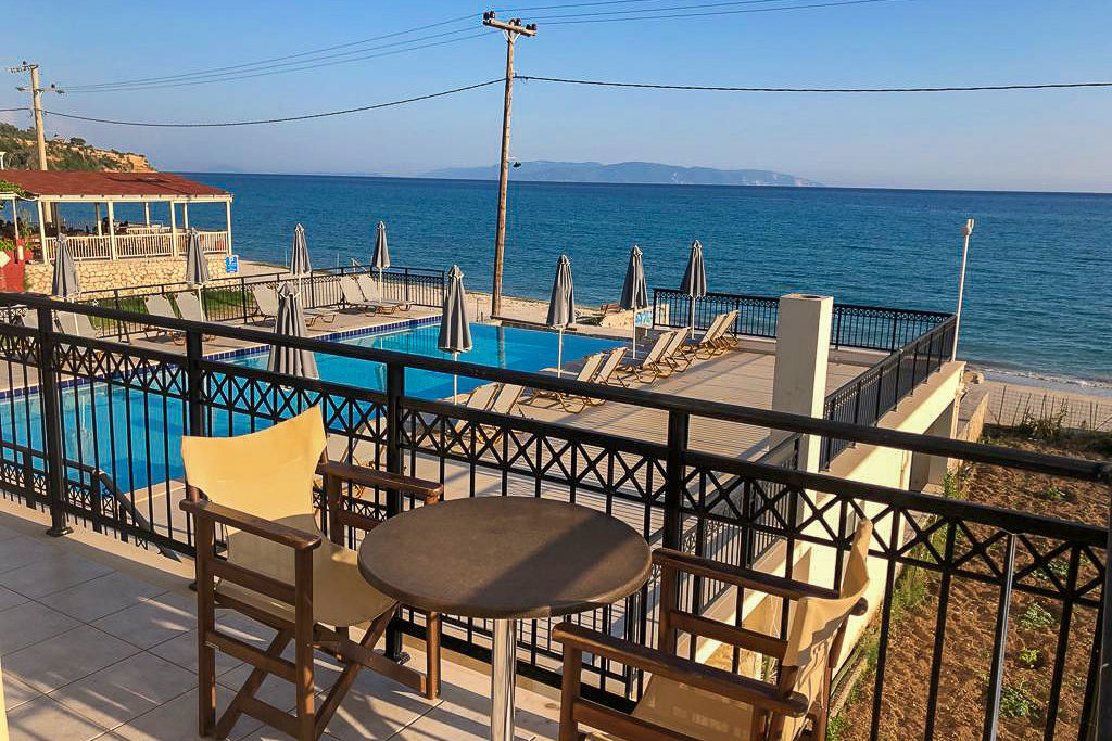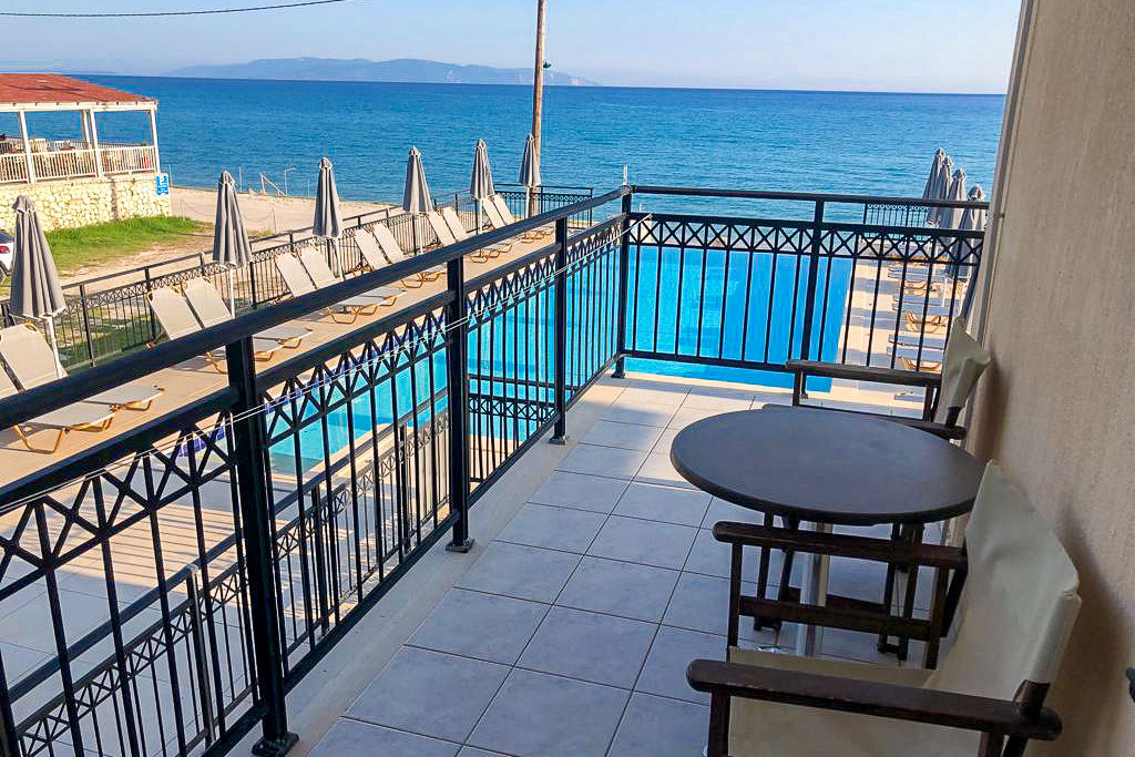 Beachfront. 750m from Lourdas resort centre.Complete Booking