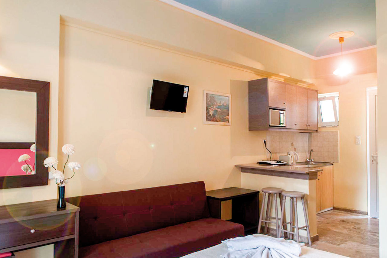 Studios sleep up to 3 adults and have bathroom containing a shower, air conditioning*, flat screen television, double cooking rings, fridge-freezer, kettle, toaster and balcony or terrace. Two Bedroom apartments and Three Bedroom apartments are also available.