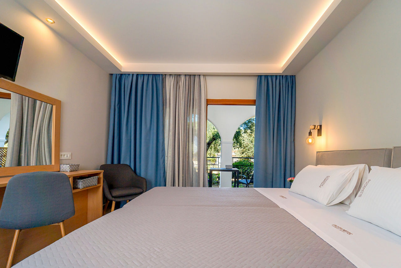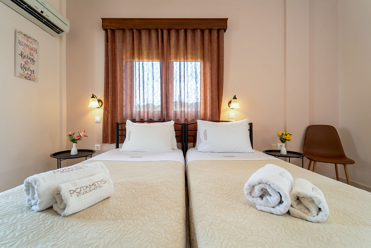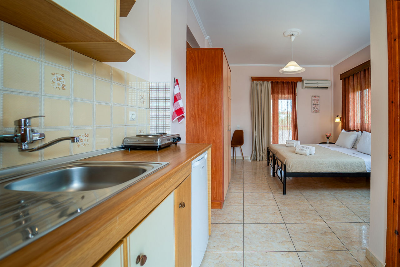 Potamitis Studios are just what the doctor ordered if an adults-only base is the key criteria. Thanks to wraparound mountains and olive groves, you can bank on a peaceful holiday scene. Super-comfy, cater-for-yourself rooms, an outdoor pool and a cocktail bar? You bet. The traditional restaurant?s another highlight, so make sure to sample the freshly cooked Greek food and snacks. You could make the most of your studio?s cooking facilities too. If you?re a bit of an explorer, the resort of Alykes is just a short walk away. A beautiful beach, waterfront restaurants and more await.Standard studios sleep up to 2 adults and have bathroom containing a shower, air conditioning, flat screen television, fridge, kettle and balcony or terrace. Room upgrade options are also available.