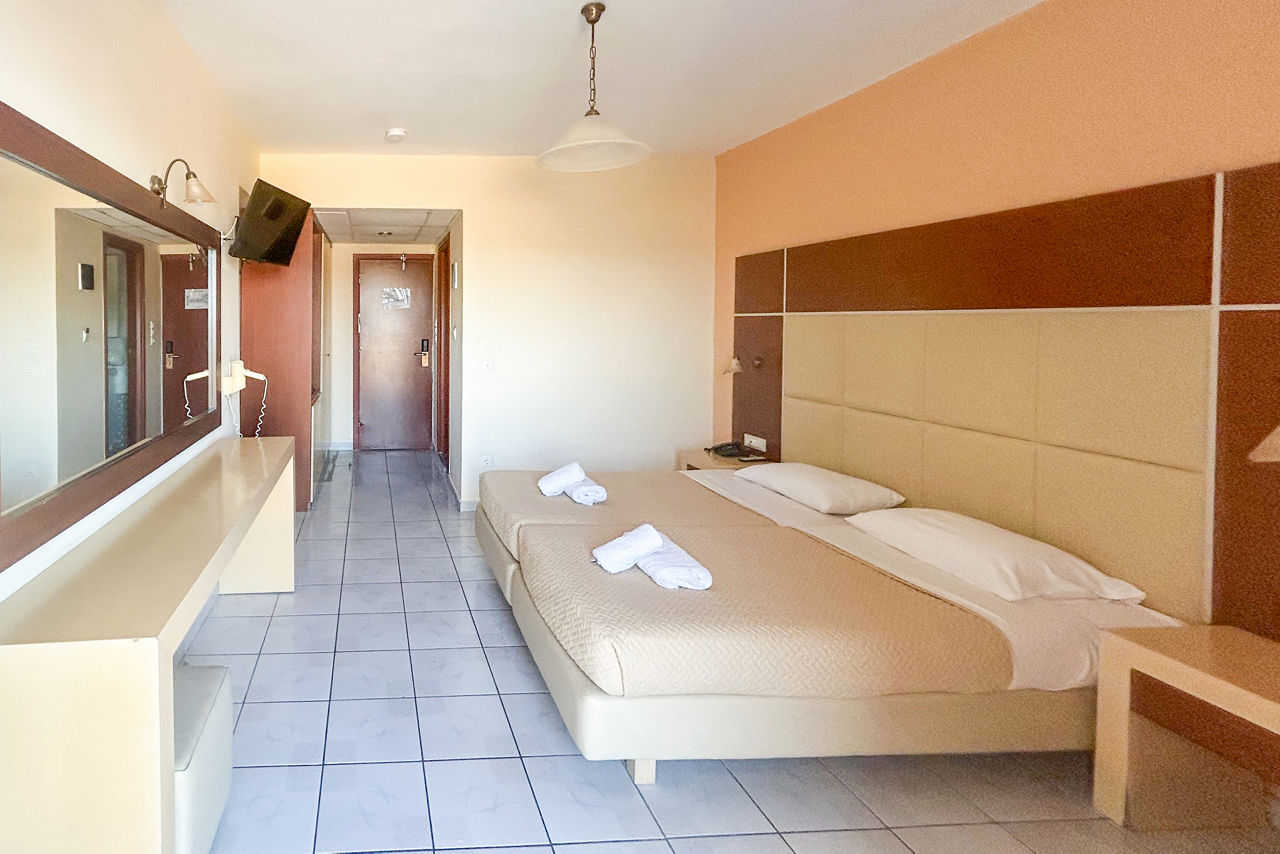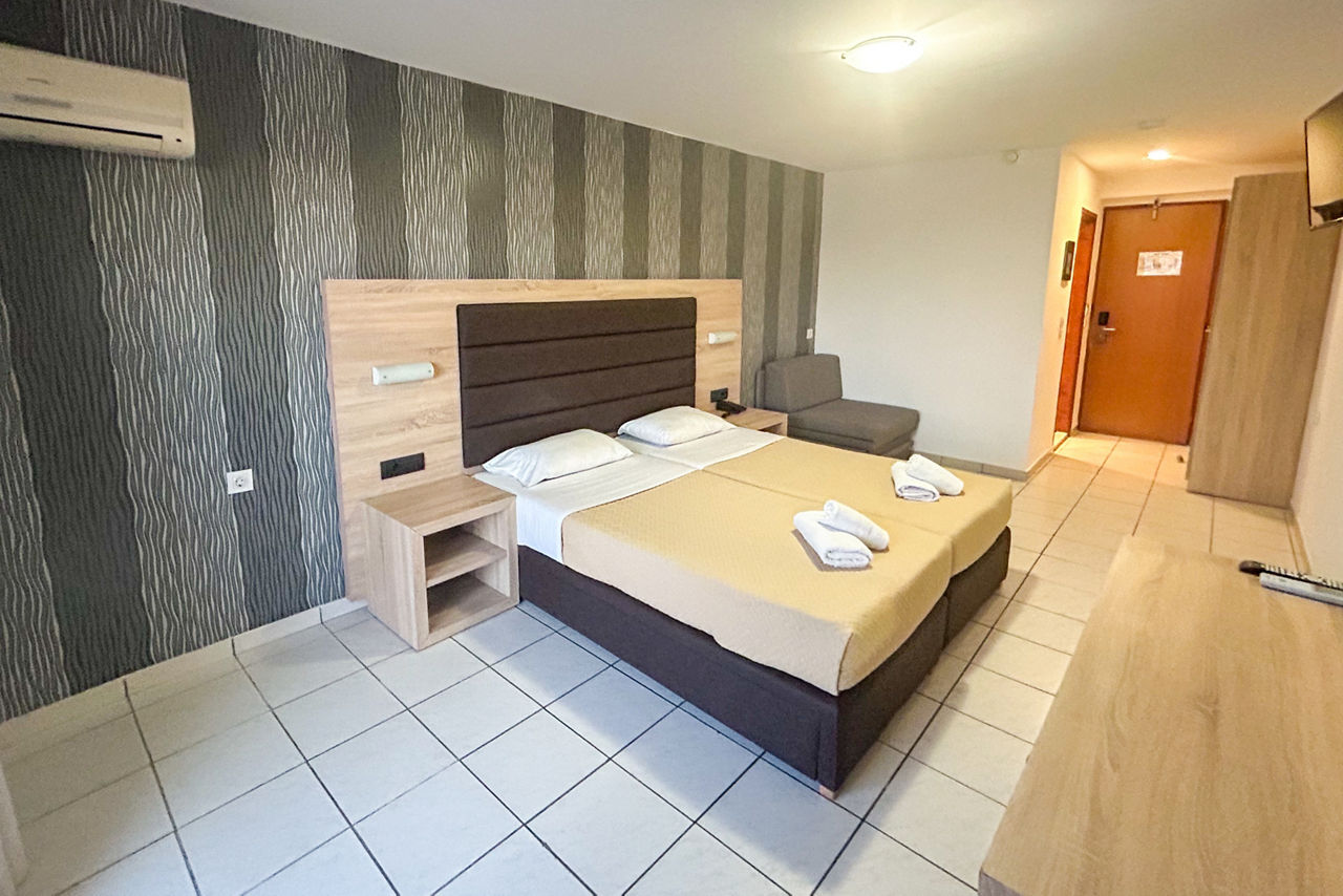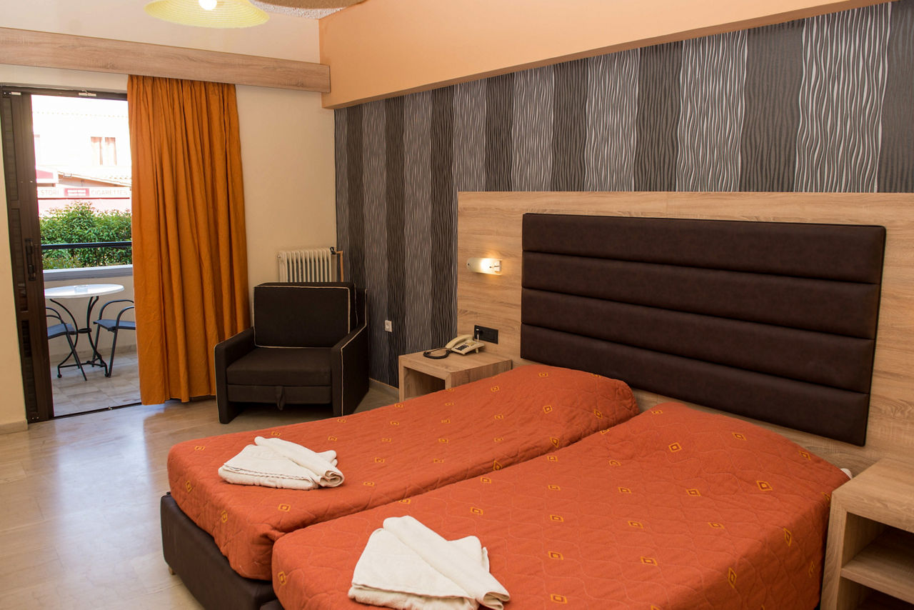 Great by name, and by nature, this upbeat party base is where the action?s at. There?s a handy on-site mini-market for stocking up on essentials, plus a golden sandy beach close by. It's postcode perfect for Laganas? lively nightlife too. In fact, it couldn?t be closer if it tried.Double and Twin rooms sleep up to 3 adults and have a bath with shower, television, hairdryer, fridge*, air-conditioning* and a balcony or terrace.