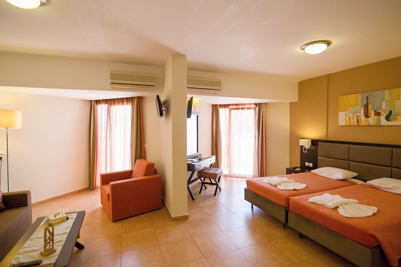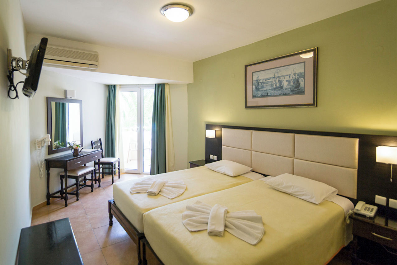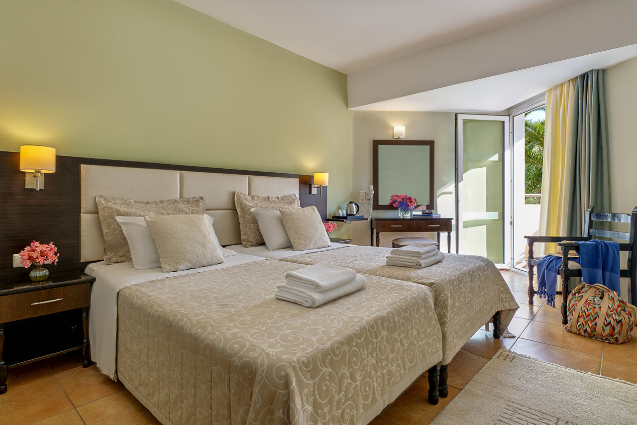Standard double rooms sleep 2 adults and have double or twin beds, bathroom with shower, air conditioning*, free Wi-Fi, satellite TV, fridge, tea and coffee making facilities, hairdryer, safety deposit box* and balcony. Room upgrades are available.