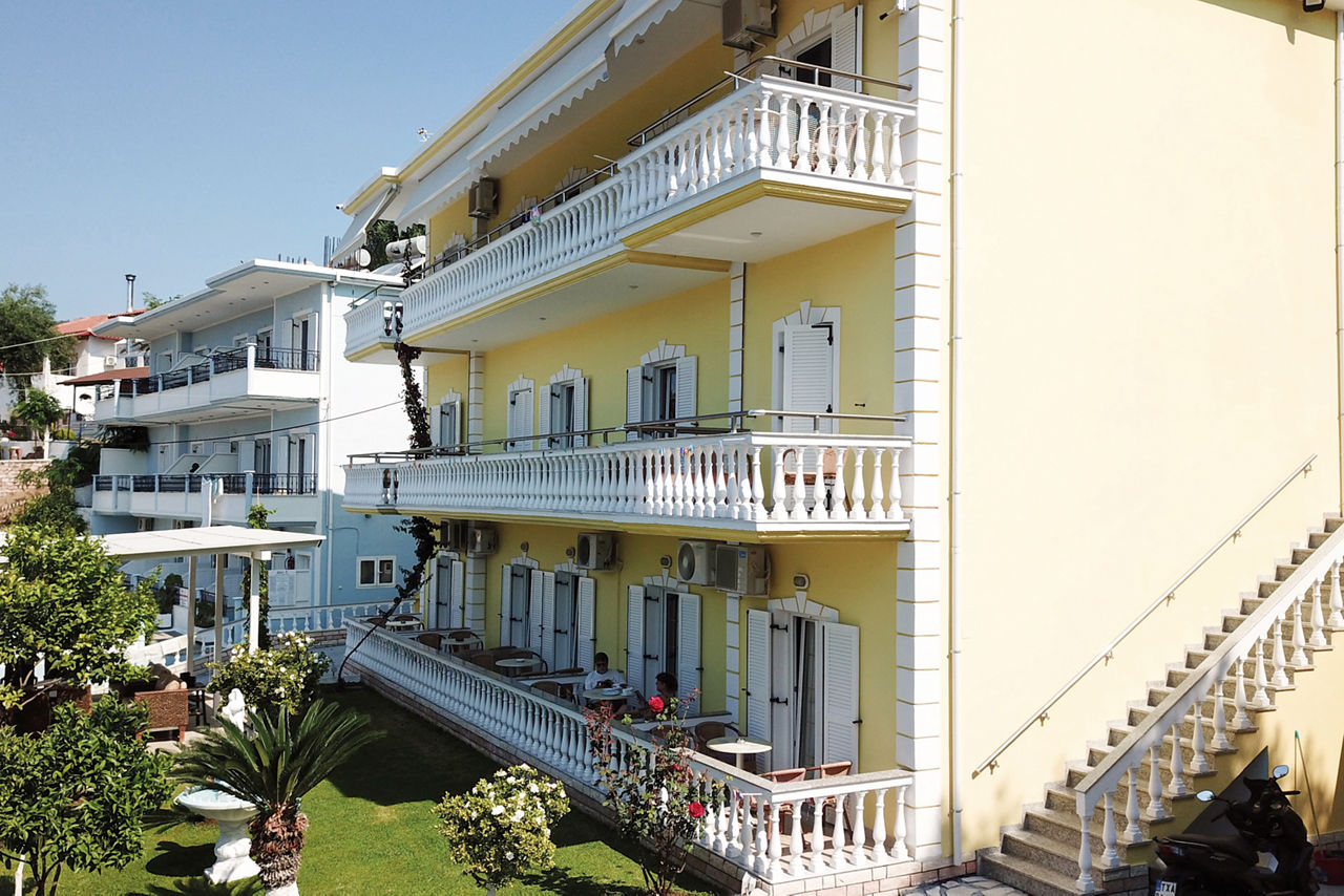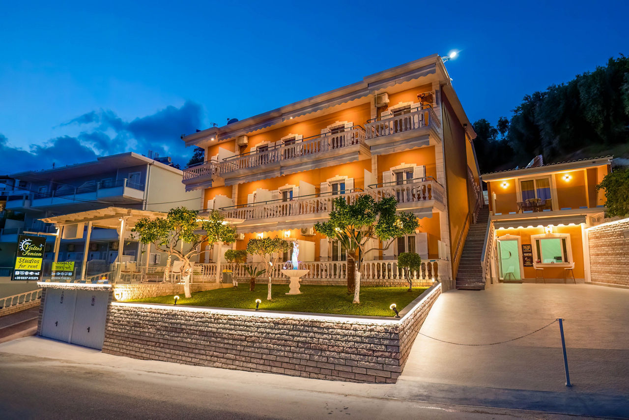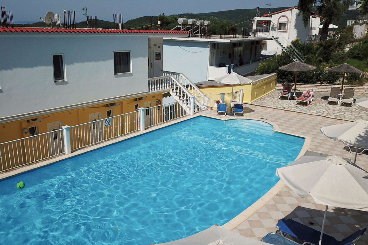 The Valtos Ionion scores rave reviews thanks to its location, being positioned between the beautiful Valtos beach and Parga's picturesque harbour. Studios and apartments are simply furnished and well-presented, designed in a typical Greek style. On-site is an outdoor pool, perfect for cooling off in during the day, whilst evenings can be spent in one of the bars and tavernas along the waterfront.Studios sleep up to 3 adults and have bathroom, air conditioning*, television, fridge, kettle, coffee making facilities, double cooking rings and balcony or terrace.