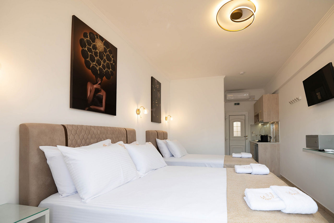 Studios sleep up to 3 adults and have bathroom, air conditioning*, television, fridge, kettle, coffee making facilities, double cooking rings and balcony or terrace.