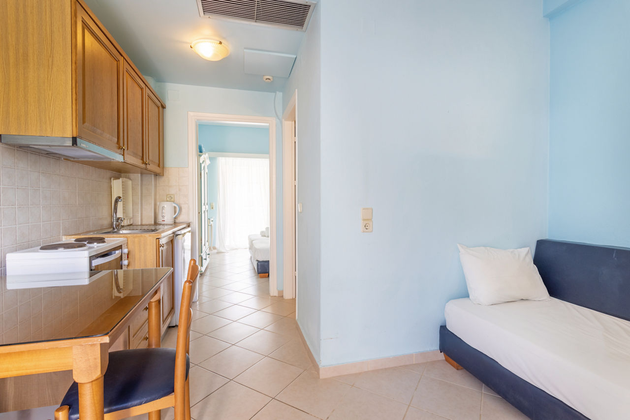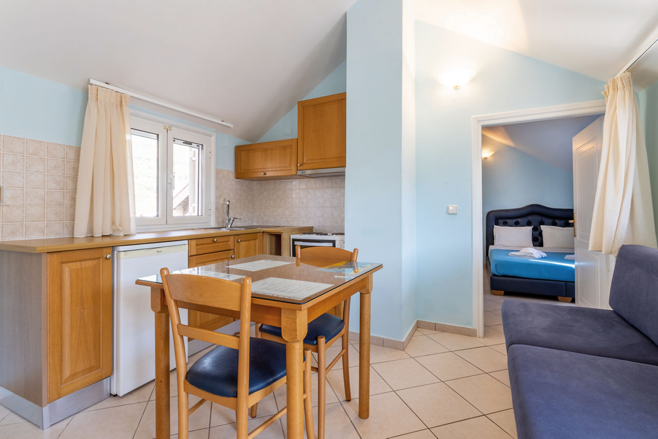 One Bedroom Attic apartments sleep up to 2 adults and 1 child and have bathroom, air conditioning*, television, fridge, tea and coffee making facilities, double cooking rings and balcony or terrace. One Bedroom apartments sleeping up to 3 adults and 1 child and Ground Floor One Bedroom apartments sleeping up to 4 adults are also available.