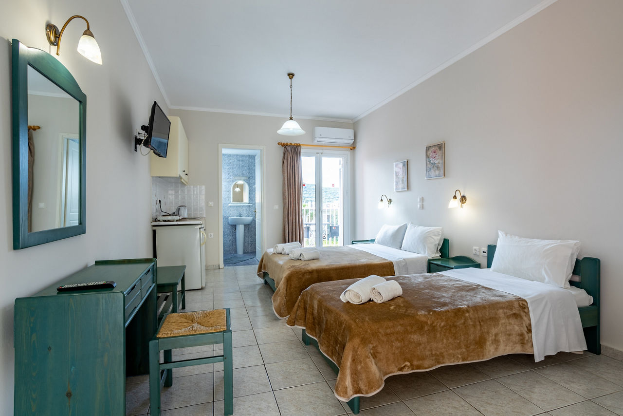 The family-run Grapevine Studios are close to local shops and tavernas while still providing a peaceful setting. The relaxing pool atmosphere is enhanced by the panoramic countryside views making it a great choice for families and couples. The traditional rooms and personalised approach provide a warm and welcoming retreat from start to finish.Studios sleep up to 3 adults and have a bathroom containing a shower, air conditioning*, cooking rings, fridge, kettle, television and balcony.