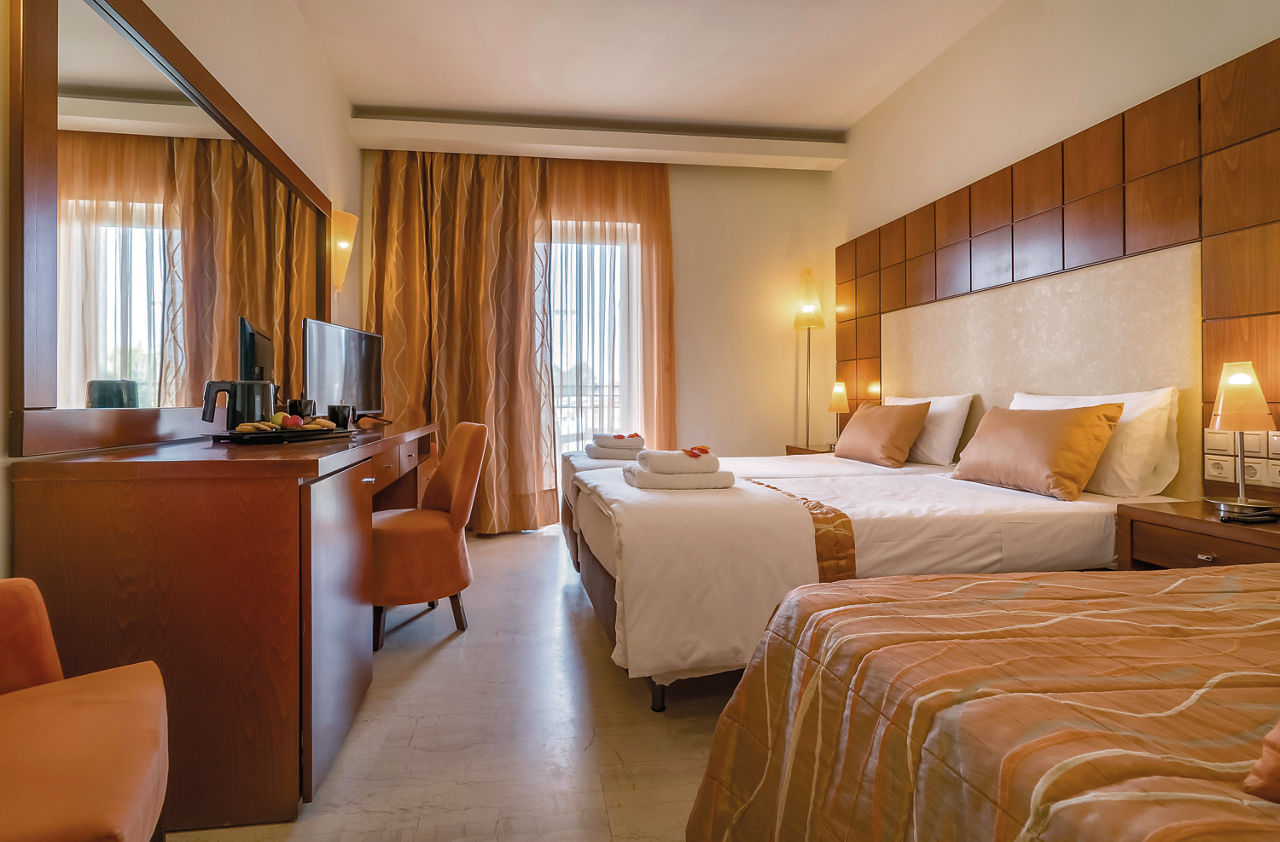 Zante Park ResortStandard rooms sleep up to 4 adults and have bathroom containing a bath, air conditioning*, hairdryer, flat screen television, fridge, tea and coffee making facilities and balcony or terrace. Room upgrade options are also available.
