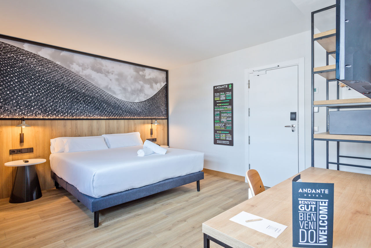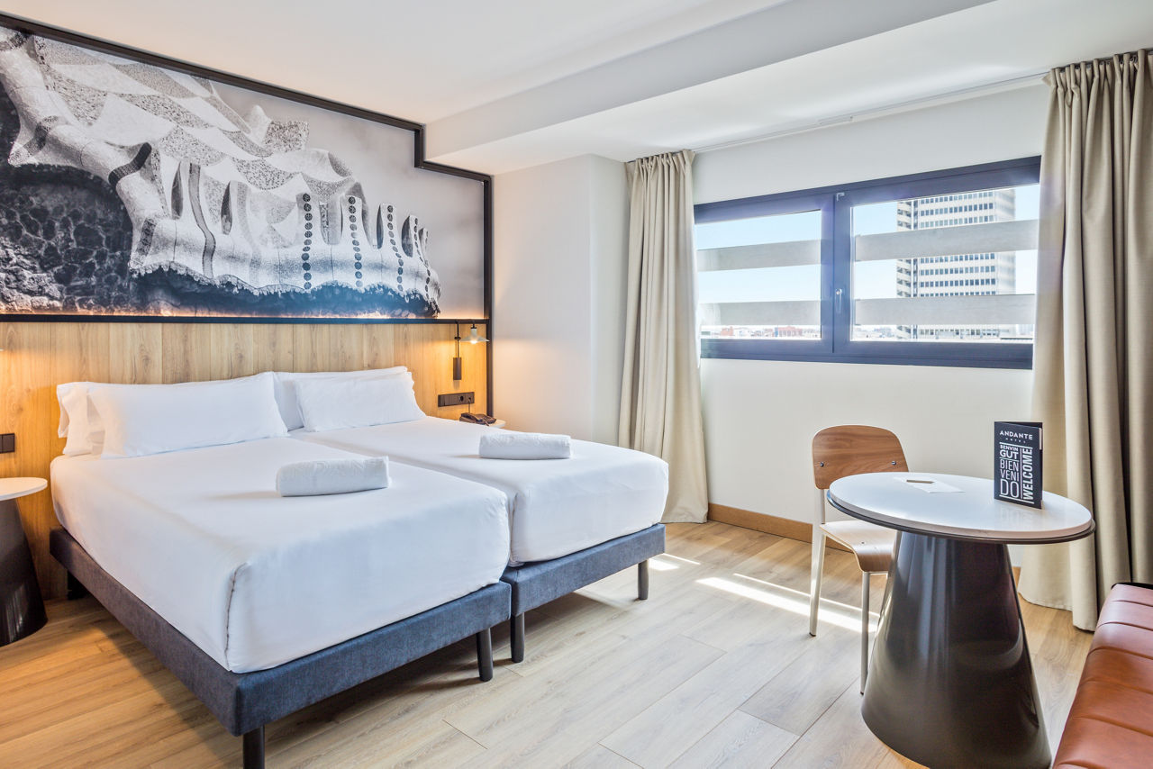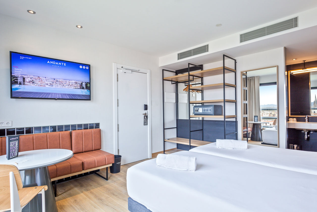 The Andante Hotel offers the twin plus's of great value along with a great location. Situated in the lively Raval quarter, close to Las Ramblas you can experience the nightlife of the area with restaurants and bars a stone's throw from the doorstep. Set yourself up for a day full of exploring with a scrumptious continental breakfast or simply relaxing by the roof top plunge pool in the summer months, enjoying the spectacular views across the city. Along with a gym and on point service, this hotel serves up the perfect base from where to enjoy this amazing city.Standard Double or Twin rooms sleep up to 2 adults and have bathroom containing a shower, hairdryer, flat screen television and a safety deposit box. Room upgrade options and Sole Use rooms are also available.